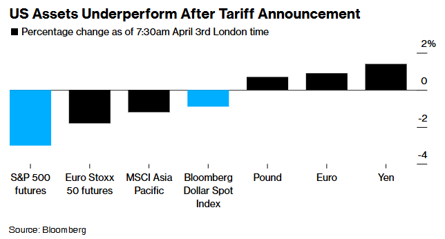 在特朗普宣布对等关税后,全球股市普遍遭遇抛售。欧洲方面,欧洲斯托克50指数跌近2%,德国、英国、法国基准股指均跌超1%。亚洲方面,日经225指数跌近3%,韩国KOSPI跌近1%,越南VN30指数则跌近7%。但相比之下,美国股市的表现更糟。截至发稿,美股期货大幅跳水,标普500指数期货、纳指期货均跌约3%。