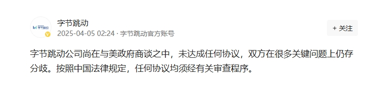 字节跳动发布声明称,字节跳动公司尚在与美政府商谈之中,未达成任何协议,双方在很多关键问题上仍存分歧。按照中国法律规定,任何协议均须经有关审查程序。