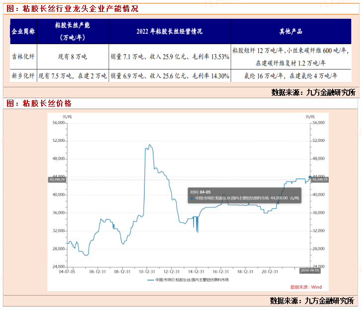 粘胶长丝相关公司:新乡化纤:粘胶长丝产能9万吨,另有20万吨氨纶产能,氨纶价格底部运行,奥运年、欧洲杯,运动服装可能带动氨纶行业景气边际向好。公司股价底部位置,毛利率连续两个季度提升,一季度业绩有望拐点向上。粘胶长丝价格每上涨1000元/吨,业绩增厚约7000万元。