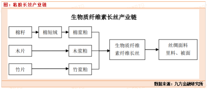 粘胶长丝又称为“人造丝”或“生物质纤维长丝”,属于再生纤维的一种,是以棉浆粕、木浆粕或其他天然纤维为原料,经碱化、黄化等工序制成纺丝原液,经湿法纺丝而制成。作为天然真丝的替代品,粘胶长丝具有光滑凉爽、透气、抗静电、染色绚丽等特性,在主要纺织纤维中含湿率最为符合人体皮肤的生理要求,主要应用于高端服装和家用纺织品。此外,粘胶长丝还可以与其他纤维结合制出服装面料、里料、金丝绒、装饰布、电脑绣花线等高档次织物,同时也应用于医用和工业领域。