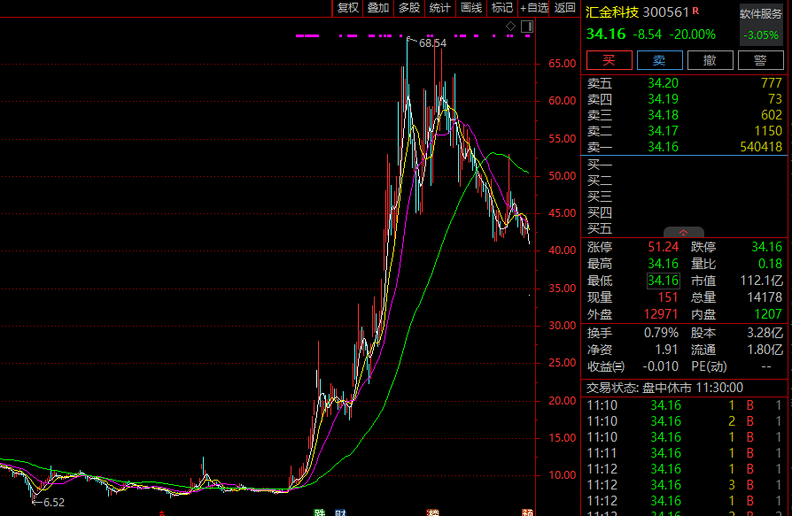 汇金科技早间开盘一字跌停,截至午间收盘,跌停板处封单高达逾5400万股,成交仅约140万股。此前,汇金科技因搭上人工智能的东风,股价在短短的3个月时间,最高涨至超68元,涨幅逾750%。