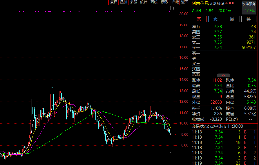 早间,创意信息也开盘20%一字跌停,截至中午收盘,跌停处封单高达逾5000万股,仅成交约580万股,创多年来最低成交。