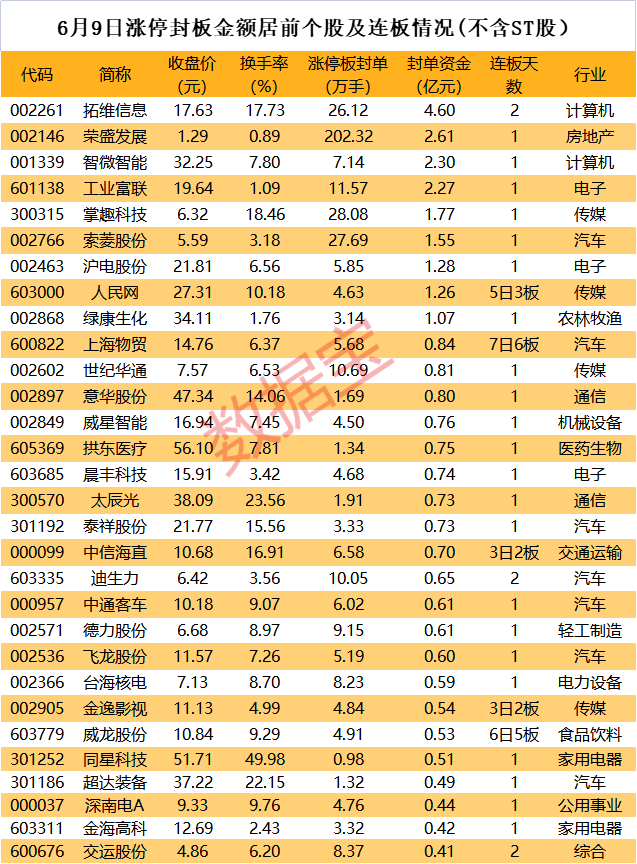 以封单金额计算,9股封单金额超亿元,拓维信息、荣盛发展、智微智能封单金额居前,分别为4.6亿元、2.61亿元、2.3亿元。
