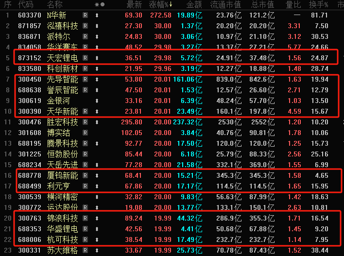 今日A股新能源方向全线爆发,储能、电池板块涨幅居前,A股今日30CM、20CM涨停榜单中(共22只股票),天宏锂电、先导智能、誉辰智能、金银河、天华新能等10只个股来自该领域。