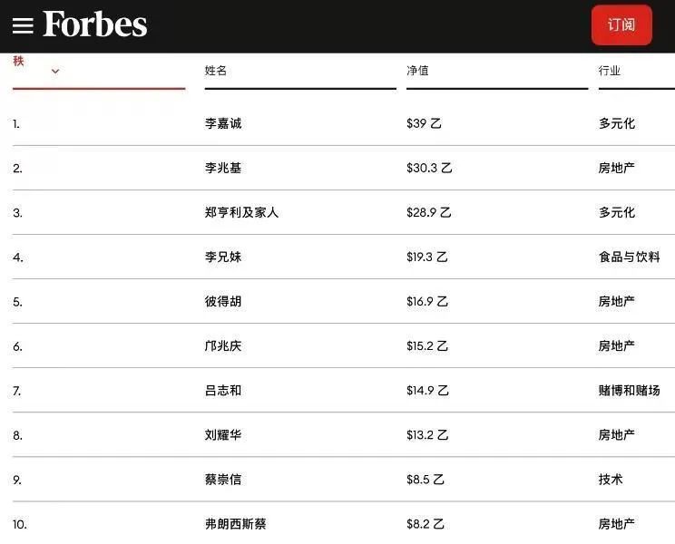 2月23日,《福布斯》公布2023年度香港50大富豪榜。其中长实创办人李嘉诚以身家390亿美元,蝉联香港首富宝座。
