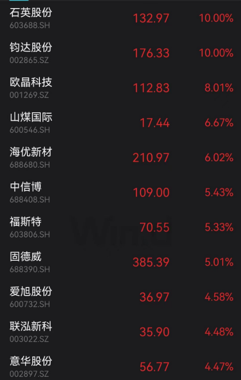 今日新能源赛道反弹,光伏领涨。截至收盘,钧达股份、石英股份涨停,欧晶科技、海优新材、福斯特、固德威等涨逾5%,晶科能源、阳光电源和“光伏茅”隆基绿能涨幅也在3%以上。