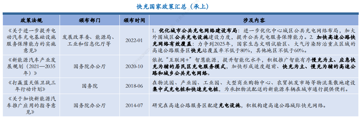 2022年政策提出,在我国现行直流充电接口技术方案基础上,进一步提高充电电流电压,全面支持快充基础设施的建设。2023年最新政策提出要通过加强科技创新引领,从而提升车网双向互动能力,鼓励新技术创新应用,加快推进快速充换电、大功率充电等技术研究。国家和地方政策接连落地下,快充网络建设按下快进键。