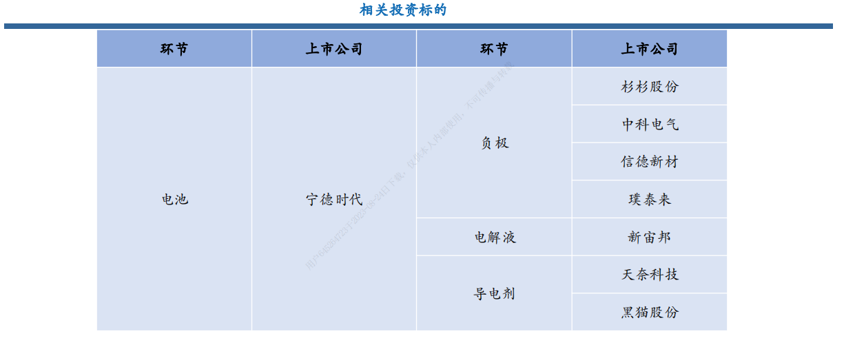 在超级快充模式下,从电池材料到电芯体系设计以及充电模式等都会影响到电池的性能保持,材料原子层级到车用系统层级都可能成为影响锂离子电池快速充电的因素。因此,快充动力电池将是继高镍之后又一次重大技术升级。作为复杂的电化学系统,快充电池涉及到的电池体系的重新设计、负极材料的改性、电解液配方的优化、隔膜的升级、导电剂、粘结剂等辅材的搭配等上游材料都有望充分受益。梳理产业链环节相关投资标的,主要如下: