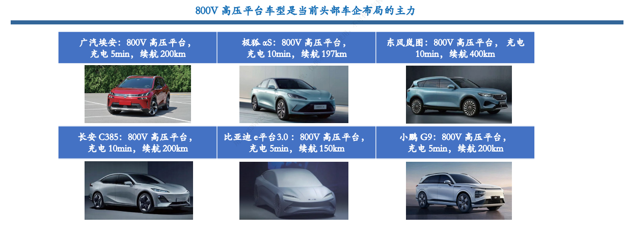 为匹配用户快速充电需求,车企正加快发展大功率高压快充,充电时间向10分钟以内迈进。2021年以来,国内外车企掀起了一轮800V电压平台车型发布潮,广汽埃安、比亚迪e3.0、小鹏G9的800V高压车型充电仅需5min,此外北汽极狐、东风岚图、长安C385、吉利极氪001等高电压平台车型均已经实现上市销售,正加速渗透。