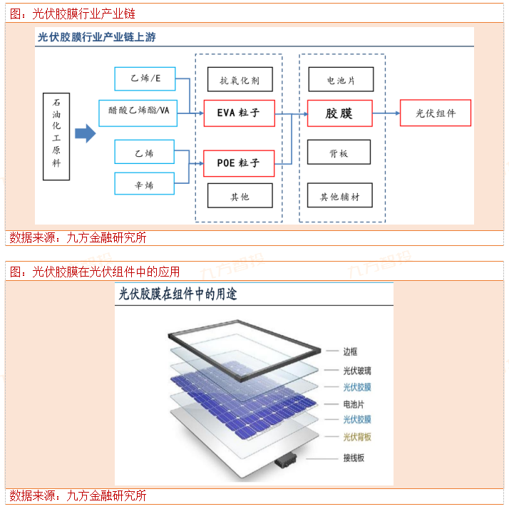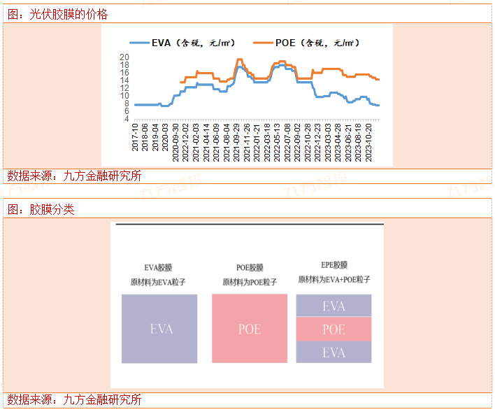 胶膜上游原材料是EVA粒子和POE聚烯烃弹性体,成本占比胶膜总成本的80%-90%,胶膜按照原料的不同分为EVA,POE和EPE胶膜,poe胶膜可以有好一点的抗PID效应,POE弹性体国内没有国产,基本全部海外进口,所以价格高过EVA胶膜。