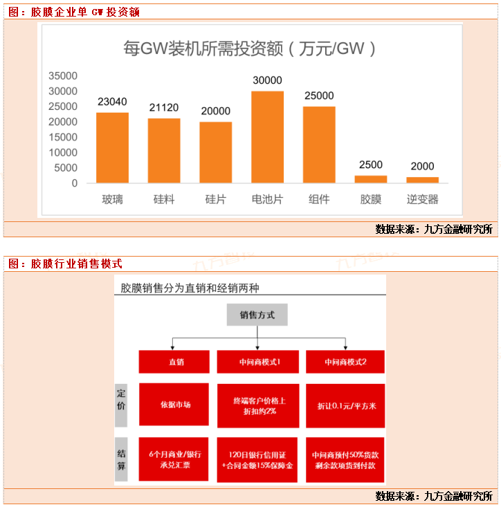 胶膜行业简介:胶膜属于在属于光伏产业链辅材环节中,起到保护起到保护光伏电池片的作用,避免受到户外风沙、水汽等的侵害,延长光伏组件使用寿命。由于光伏组件的封装过程不可逆,一旦胶膜的黄变、破裂、脱层等现象将会导致组件失效报废,在光伏组件质量和寿命中起到重要作用,技术难度在于,光伏组件寿命要求20-25年,胶膜需要保证20-25年能不老化,黄变。胶膜成本占比整个组件的5%-7%左右。