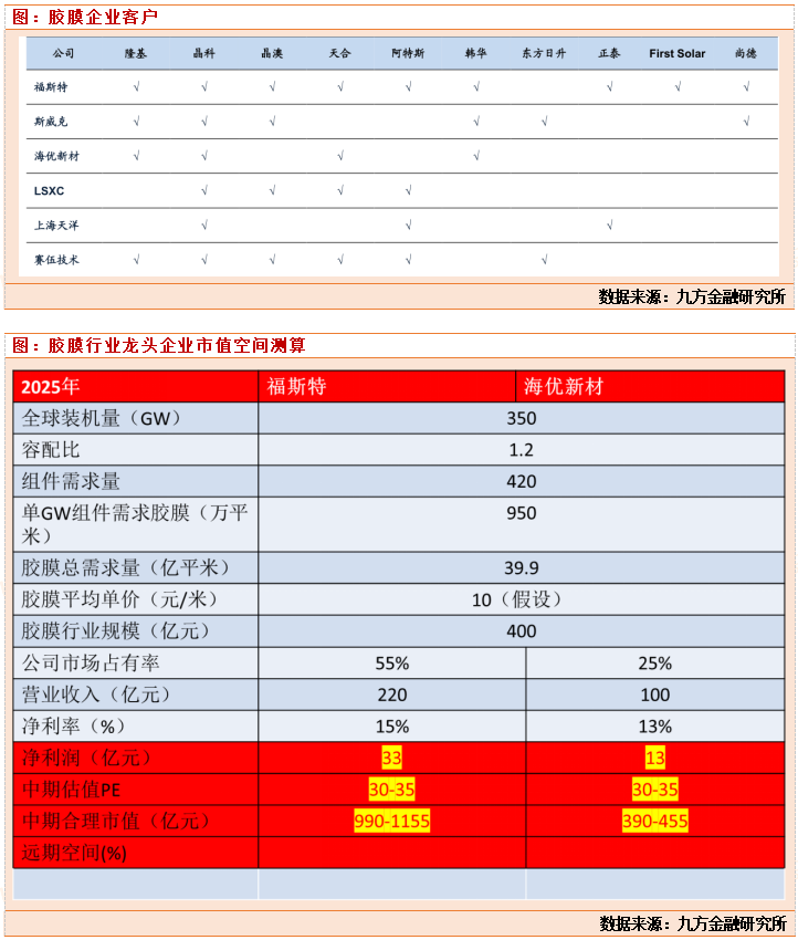 胶膜行业市场远期规模测算:以25年350GW光伏装机+1.2倍容配比+每GW组件需胶膜900万平米+胶膜单价10元/平米测算(保守),胶膜总市场约378亿元规模。