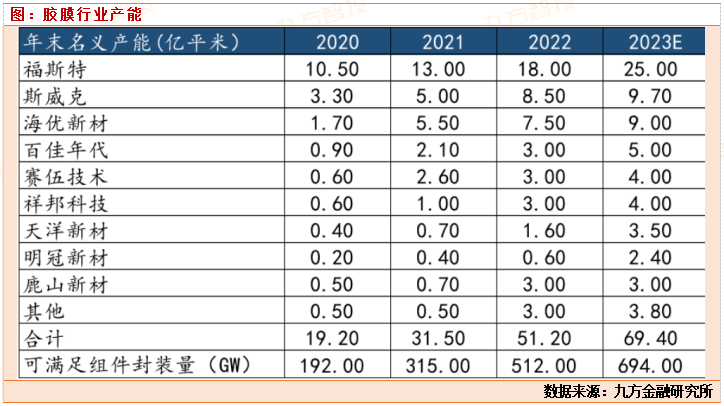 胶膜行业竞争格局:一超多强的竞争格局。福斯特长期胶膜出货量占据行业50%以上的市场份额,近两年,随着海优新材,赛伍技术,鹿山新材,上海天洋的一众上市,二线胶膜厂,开始从资本市场募集资金进行扩张,抢占市场份额,胶膜的产能也从20年15亿平米增长到22年32亿平米,如果胶膜厂满产,可以供给330GW的组件装机量。