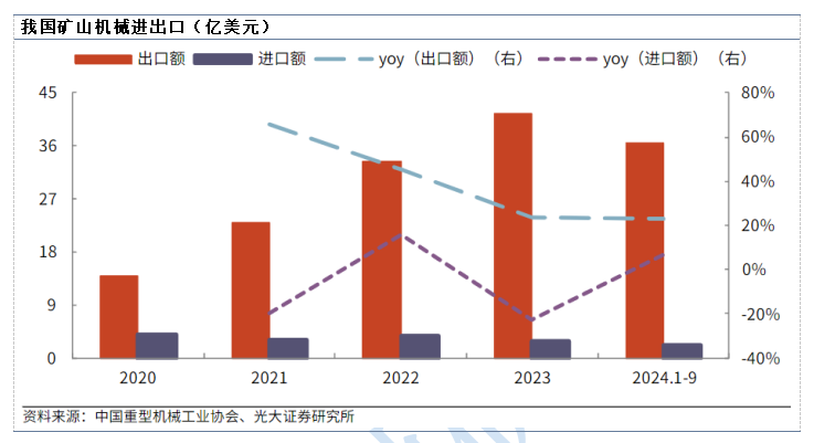 根据CEIC,2016-2017年铜价处于底部区间,我国对外采矿业投资亦处于较低水平,且2017年净投资额为负值。伴随着铜价的新一轮回升,中国对外采矿业投资自2018年以来逐年提升。2023年,我国矿山机械出口额41.34亿美元,同比增长23.75%。2024年1-9月,中国矿山机械出口额36.6亿美元,同比增长23.0%。