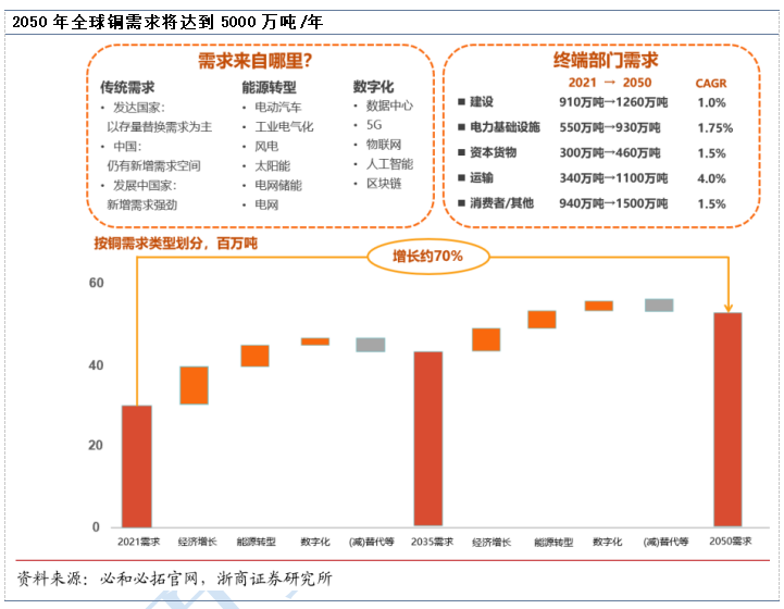 全球龙头必和必拓至预计至2050年,全球铜需求将增长约70%,达到5000万吨/年,CAGR=2%。过去全球铜需求主要由建筑、机械等传统需求驱动,未来将转向由能源转型和数据中心驱动,传统/能源转型/数据中心需求占比将由现在的92%/7%/1%调整为71%/23%/6%。