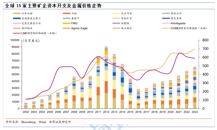 1)2002-2012年,铜、金价格指数一路上升,在2012年左右分别达到各自的阶段高点,同一时期,15家主要矿企的资本开支总额从86亿美元增长至910亿美元,CAGR为26.7%;
