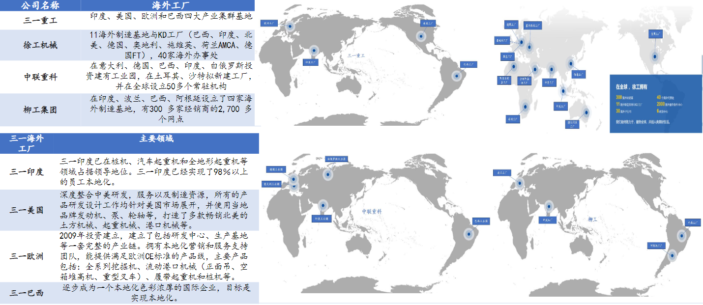 四大主机厂徐工机械、三一重工、中联重科及柳工海外基地分布