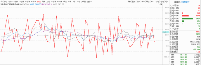 今天,大盘全天震荡调整,三大指数均小幅下跌,深成指领跌。板块上,AI概念股全天冲高回落走势分化,电商、教育、传媒等应用方向相对较强,世纪天鸿20CM涨停,奥飞娱乐5连板,慈文传媒、中国科传3连板;算力、CPO等硬件方向陷入调整,上海电影跌停,浪潮信息、剑桥科技、久远银海、首都在线等多只高位股大跌。旅游酒店股尾盘逆势爆发,曲江文旅4连板。医药股震荡反弹,CRO方向领涨,宣泰药业20CM涨停,美迪西、成都先导涨超10%。下跌方面,半导体板块陷入调整。总体上两市个股跌多涨少,超2900股下跌,亏钱效应加大。