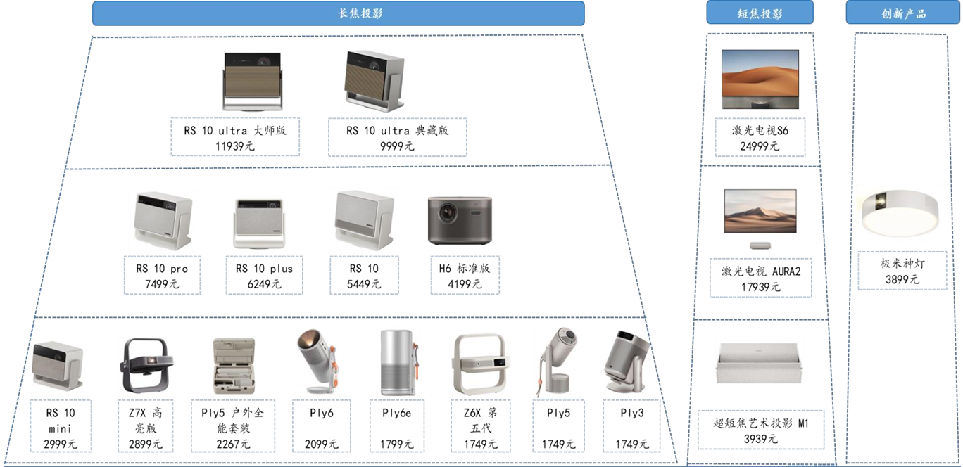 产品突破期(2014-2018):2014年推出首款量产智能投影产品Z3,产品智能化能力突出, 推动了投影产品向消费级场景的渗透,2018年更凭借Z系列登顶国内投影出货量第一,并蝉联至今(IDC数据),打破外资品牌垄断;