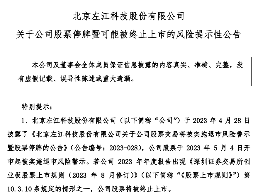 4月28日晚间,*ST左江发布《关于公司股票停牌暨可能被终止上市的风险提示性公告》,表示公司经审计的净利润为负值且营业收入低于1亿元且公司2023年度财务报表被出具了非标准审计意见的审计报告,公司股票将被终止上市。公司股票自2024年4月29日开市起停牌。