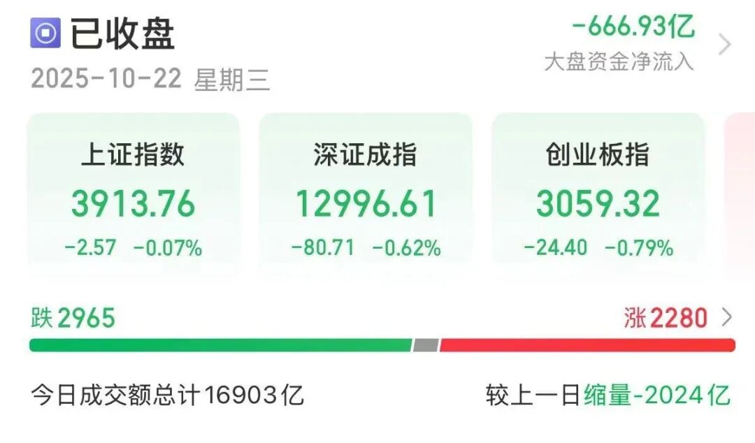 10月22日,A股三大指数集体调整。截至收盘,上证指数跌0.07%、深证成指跌0.62%、创业板指跌0.79%。全市场全天成交额16903亿元,较上个交易日缩量2024亿元。