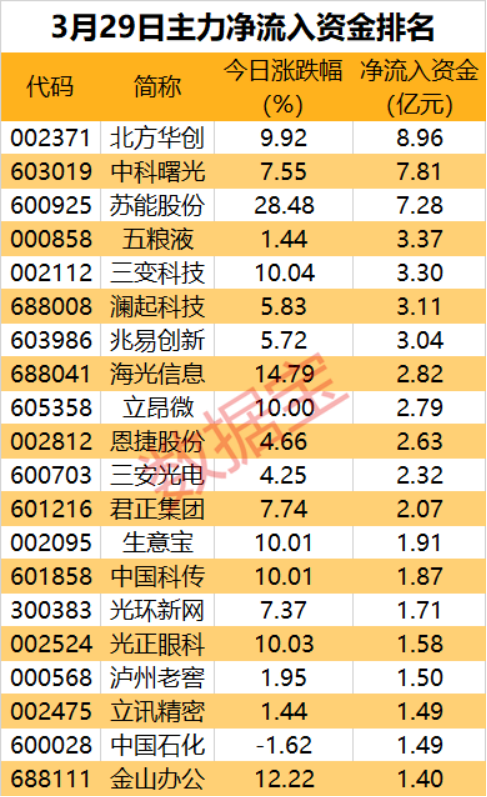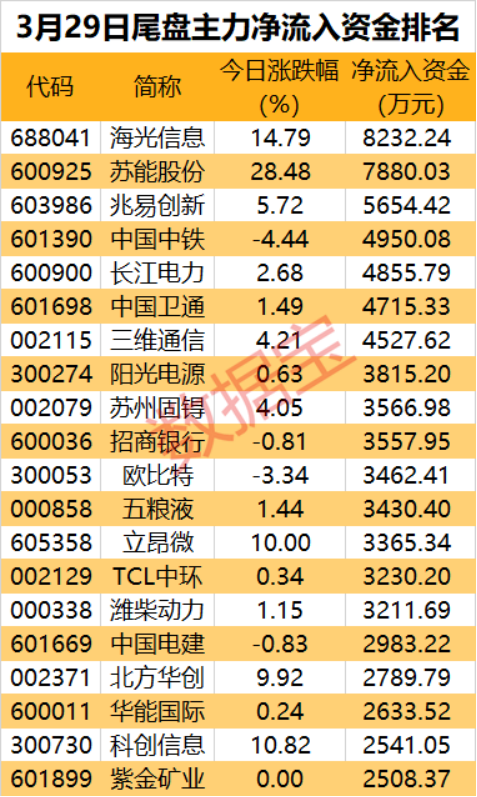 从个股看,有15股尾盘净流入资金超3000万元。海光信息、苏能股份、兆易创新尾盘获主力抢筹超5000万元。