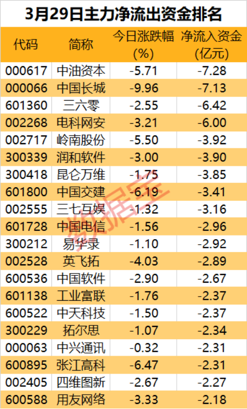 数据宝统计,9股遭主力资金净流出超3亿元,多只信创板块个股被抛售。中油资本、中国长城的主力资金净卖出金额居前,均超7亿元。