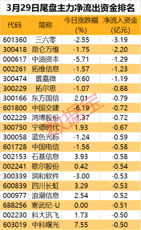 数据宝统计,尾盘5股遭主力出逃超亿元,分别为三六零、昆仑万维、中油资本、拓维信息、景嘉微。
