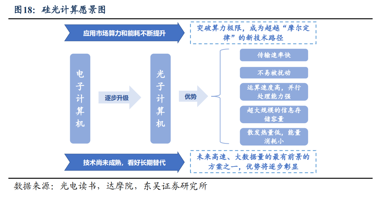 从趋势上看,以硅光芯片为基础的光计算有望持续取代电子芯片在部分计算场景中的应用。阿里巴巴达摩院预计未来三年,硅光芯片将承载绝大部分大型数据中心内的高速信息传输。