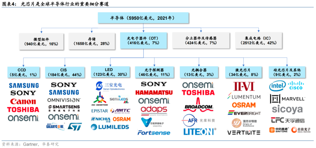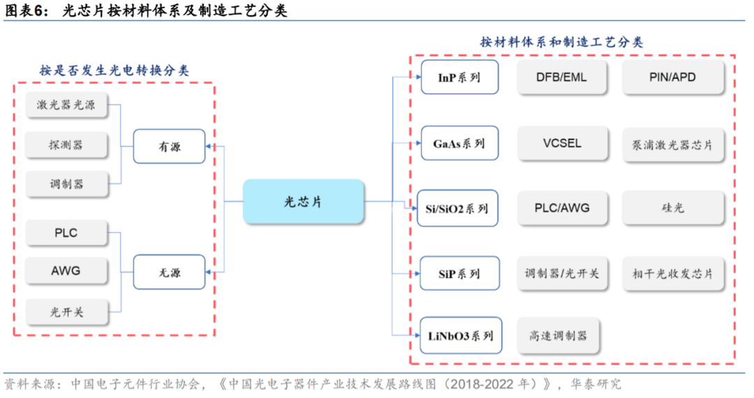 根据Gartner分类,光芯片包括CCD、CIS、LED、光子探测器、光耦合器、激光芯片等品类。按照材料体系及制造工艺的不同,光芯片可分为InP、GaAs、硅基和薄膜铌酸锂四类。