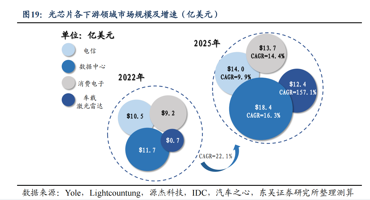 在消费领域,光芯片已广泛用于3D传感(手机、汽车)等场景,以车载激光雷达为例,光芯片是发射端、接收端核心元件,决定着激光雷达的探测距离、分辨率等多个关键性能。