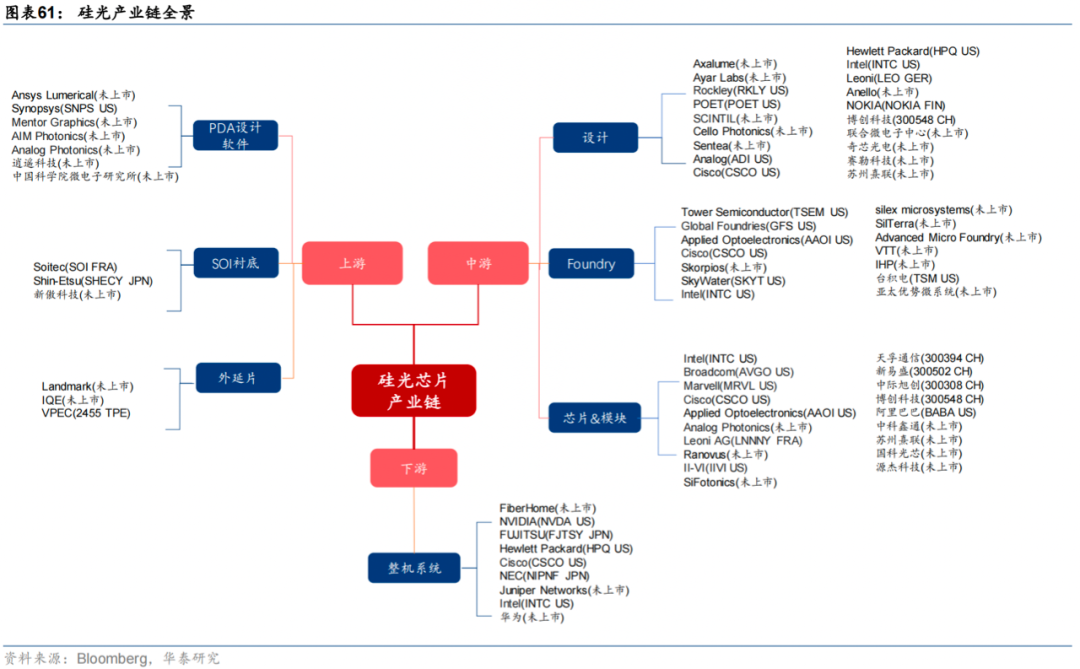 目前全球硅光领域产业化较领先的玩家包括思科、Intel和Inphi。近几年来包括思科、华为、Ciena、Juniper等巨头纷纷通过收购布局硅光技术。目前,Intel和台积电均大力开发硅光子制造工艺技术,已经形成了较为完整的硅光芯片产业链。