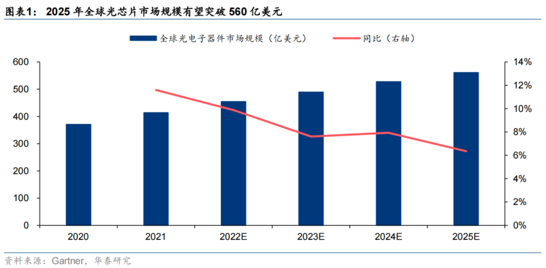 根据Gartner数据,2021年全球光芯片市场规模达414亿美元,预计2025年市场规模有望达561亿美元(约3892亿元),对应期间CAGR=9%。亿渡数据预计,2026年我国光芯片市场有望扩大至29.97亿美元。