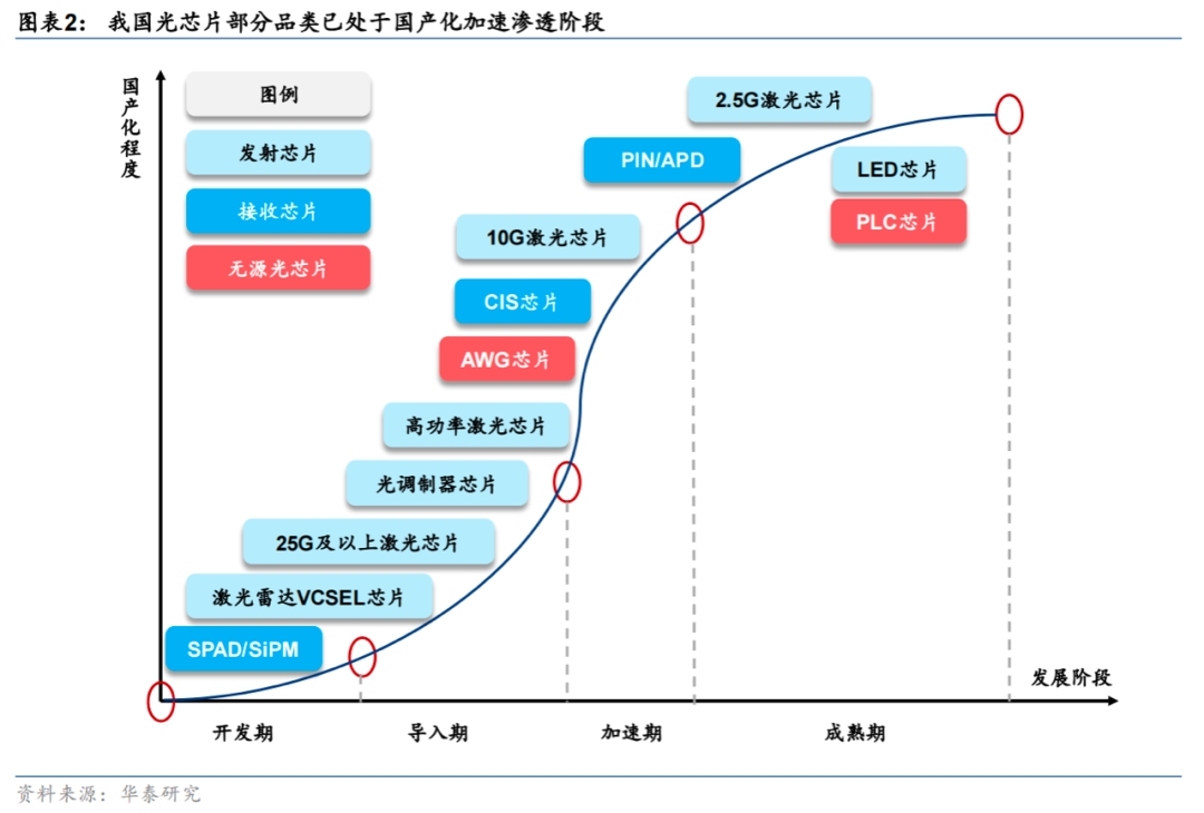 从国产化进展来看,当前我国高功率激光芯片、部分高速率激光芯片(10G、25G等)等已处于国产化加速突破阶段;而光探测芯片、25G以上高速率激光芯片仍处于进口替代早期阶段,未来国产化提升空间广阔。
