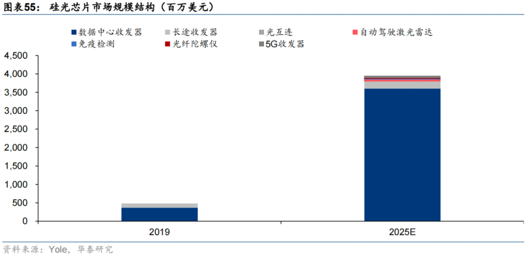 硅光芯片是基于硅晶圆开发出的光子集成芯片,在尺寸、速率、功耗等方面具有独特优势。根据Yole预测,全球硅光市场规模有望从2019年的4.8亿美元增长至2025年的39.5亿美元,2020-2025年CAGR达52.4%。