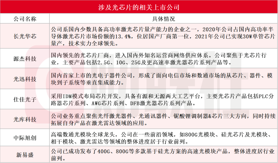 据不完全统计,涉及光芯片的相关上市公司包括长光华芯、源杰科技、光迅科技、仕佳光子、光库科技、中际旭创、新易盛等,具体情况如下: