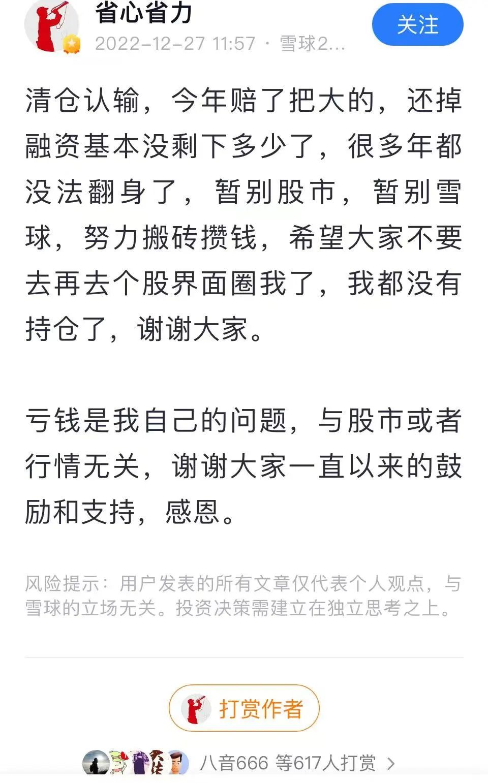 12月27日午间,曾获“雪球2021年年度十大影响力用户”称号的大V“省心省力”发布的一则消息引发关注。“省心省力”表示:“清仓认输,今年赔了把大的,还掉融资基本没剩下多少了,很多年都没法翻身了,暂别股市,暂别雪球,努力搬砖攒钱,希望大家不要去再去个股界面圈我了,我都没有持仓了,谢谢大家。”