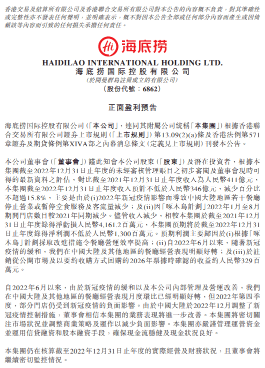 上周末,海底捞突然发布盈利预告:预计2022年实现净利润不低于13亿元,作为对比2021年海底捞净亏损额为41.61亿元;预计实现收入不低于346亿元,同比下降15.8%。