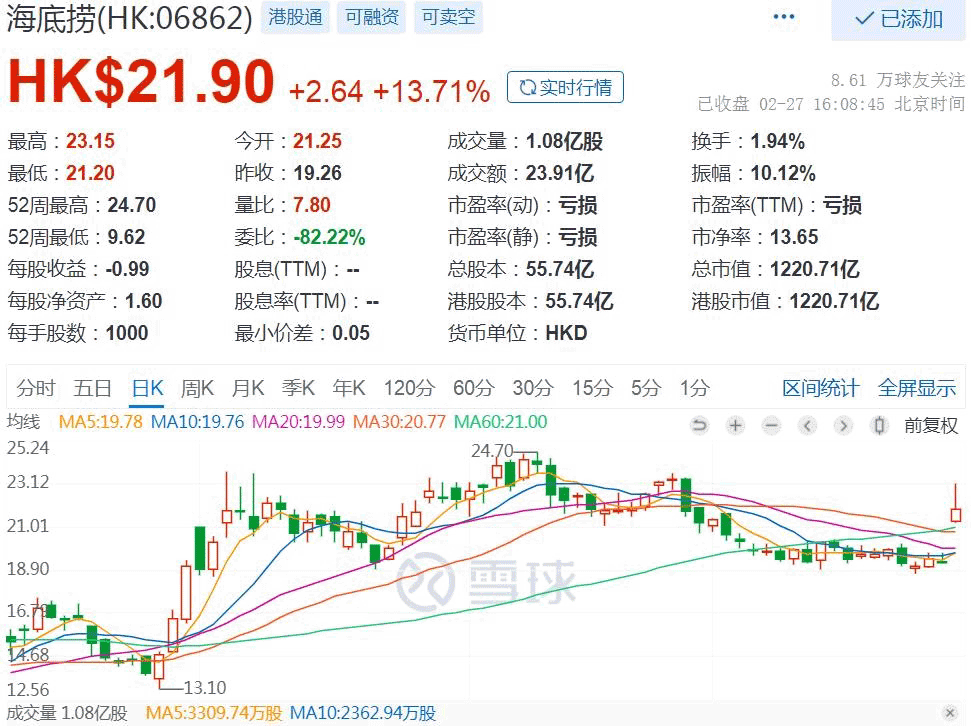 受此消息影响,2月27日早盘,港股火锅餐饮股大幅拉升,海底捞一度涨超19%,最终收涨13.71%,呷哺呷哺、九毛九、海伦司等均跟涨。