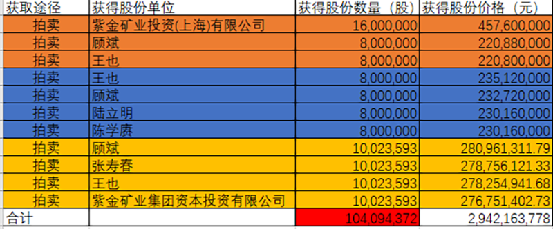 累加计算,紫金矿业阵营两家公司、自然人顾斌、王也分别竞得2602.4万股,张寿春揽入股份数也超过1000万股。