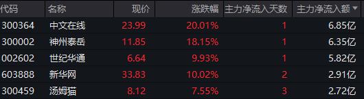 从资金流向来看,截至发稿,主力资金净流入传媒板块超46亿元,中文在线、神州泰岳、世纪华通分别获主力加仓6.85亿元、6.35亿元、5.82亿元。