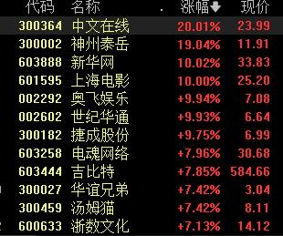 4月7日,传媒板块午后震荡走高,截至发稿,中文在线20%涨停,新华网涨停,世纪华通、捷成股份涨超9%,中原传媒、荣信文化、人民网跟涨。