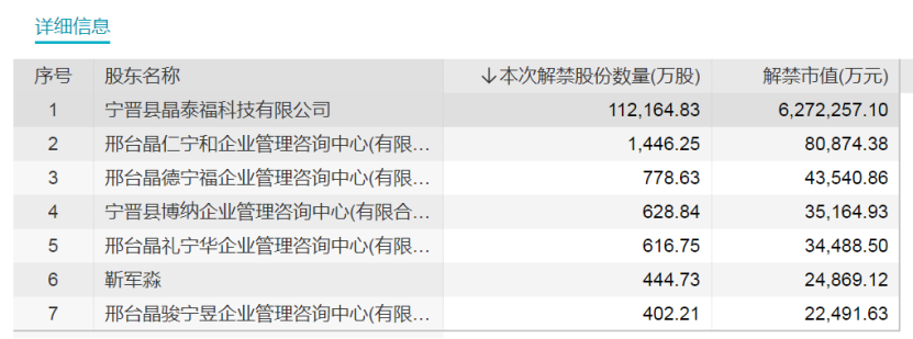 具体来看,解禁市值最大的晶澳科技为光伏组件龙头股,解禁股东为东台市晶泰福科技有限公司(曾用名宁晋县晶泰福科技有限公司)、邢台晶仁宁和企业管理咨询中心(有限合伙)等7个股东,其中东台市晶泰福科技有限公司为晶澳科技第一大股东,解禁市值超620亿元。这些股东的股份来自于晶澳科技2019年11月完成的定增,彼时的定增发行价为7.87元/股。