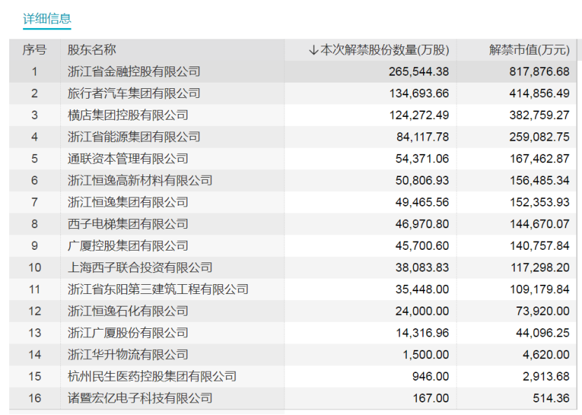 浙商银行下周解禁股东为浙江省金融控股有限公司、旅行者汽车集团有限公司、横店集团控股有限公司等16个股东,其中浙江省金融控股有限公司为浙商银行第二大股东。