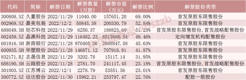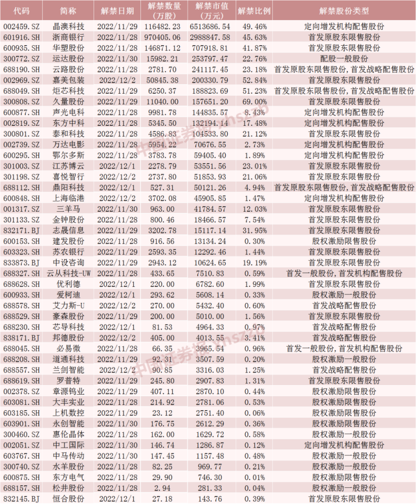 具体来看,晶澳科技11月29日将解禁11.65亿股,均为定向增发机构配售股份。浙商银行11月28日将解禁97.04亿股,均为首发原股东限售股份。华塑股份11月28日将解禁14.69亿股,均为首发原股东限售股份。