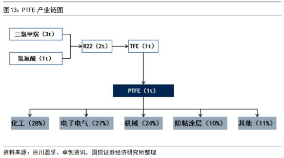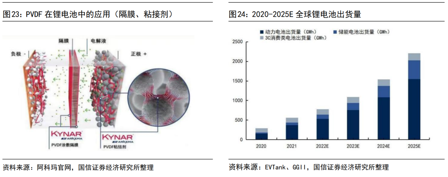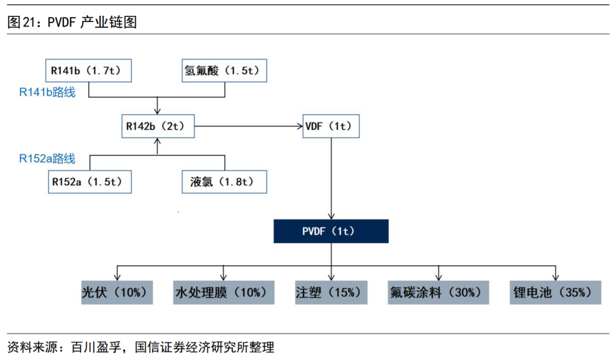 2)聚偏氟乙烯PVDF:锂电、光伏放量,PVDF需求大幅增长。聚偏氟乙烯(PVDF)属于可熔融加工氟树脂,是市场规模仅次于PTFE的第二大氟树脂。