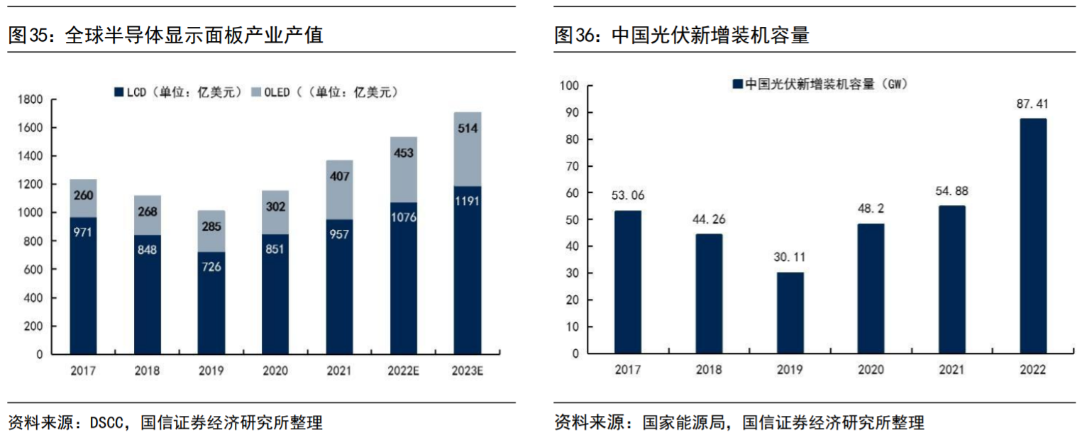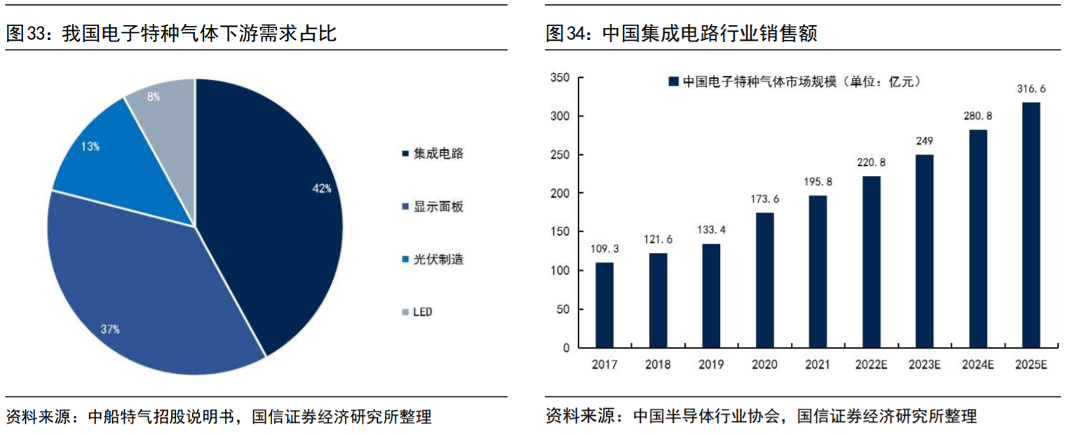 下游行业的高速发展加大企业对电子特气的需求。据亿渡数据,2021年我国应用于集成电路的电子特气占比约为43%,是电子特气第一大应用领域,显示面板、LED、光伏占比分别为21%、13%与6%。