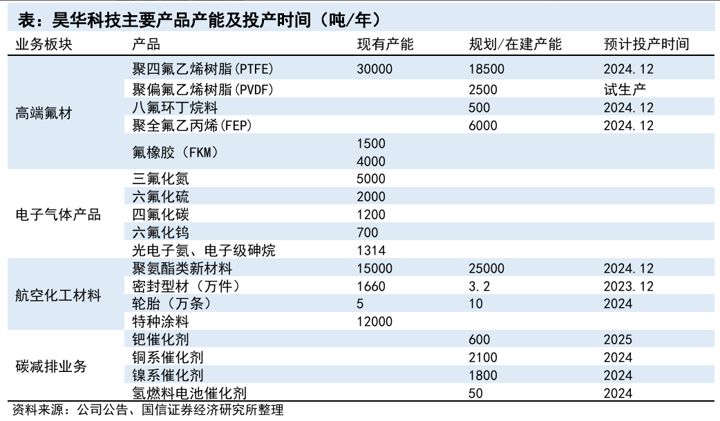 公司是一家以高端氟材料为拳头产品的公司,其核心业务包括高端氟材料、电子化学品、高端制造化工材料、碳减排业务等。公司目前拥有3万吨的氟树脂产能、5500吨的氟橡胶产能、2500吨的PVDF生产装置和自主知识产权的电子特气制备和纯化全套技术。