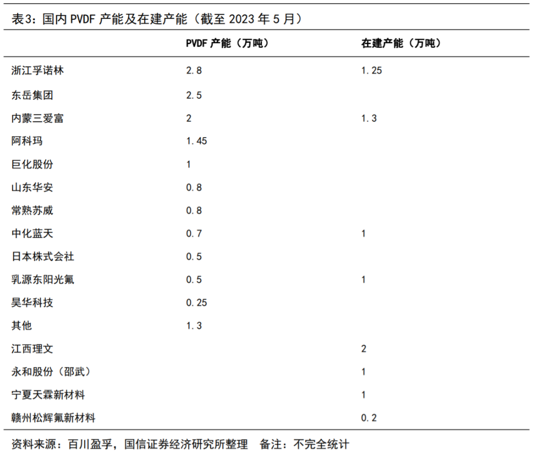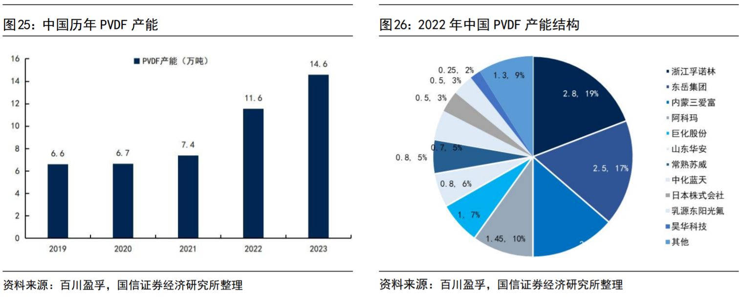 受下游需求增加驱动,国产PVDF供给快速扩张。截至2023年5月底,国内PVDF总体产能已经达到14.6万吨。据我们预测,到2025年国内PVDF产能将突破25万吨。