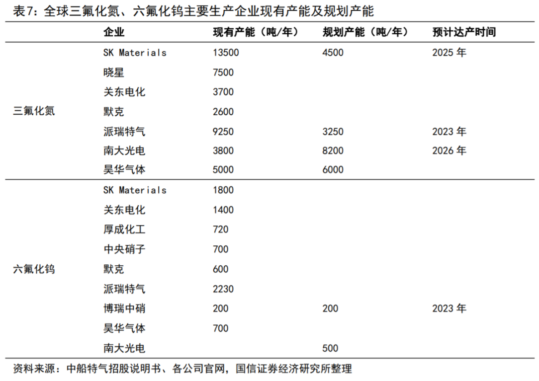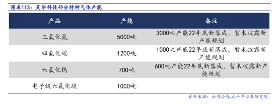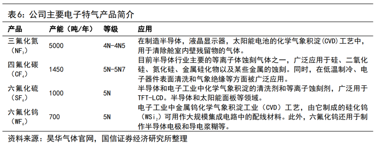 三氟化氮、六氟化钨是全球前两大电子特气产品。公司电子特气产能规模位居国内前列,规划6000吨/年三氟化氮。